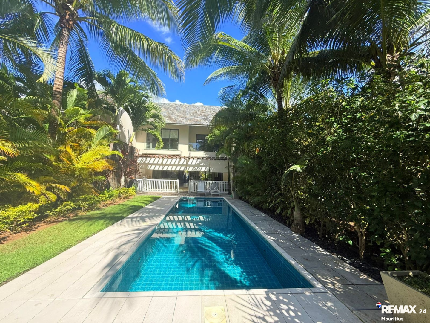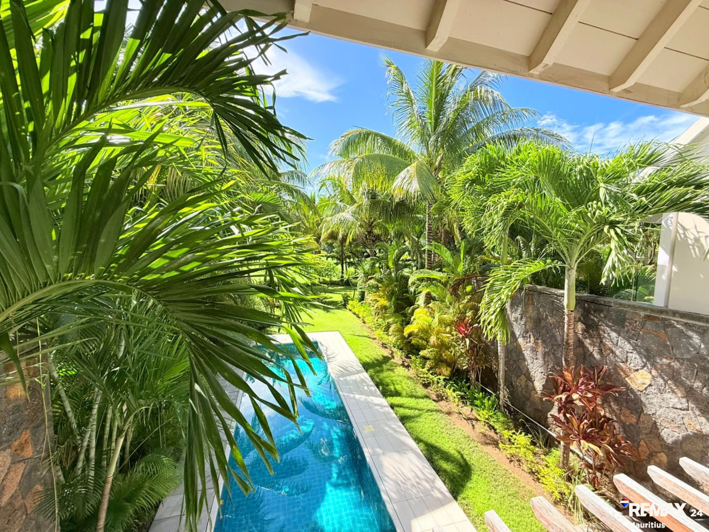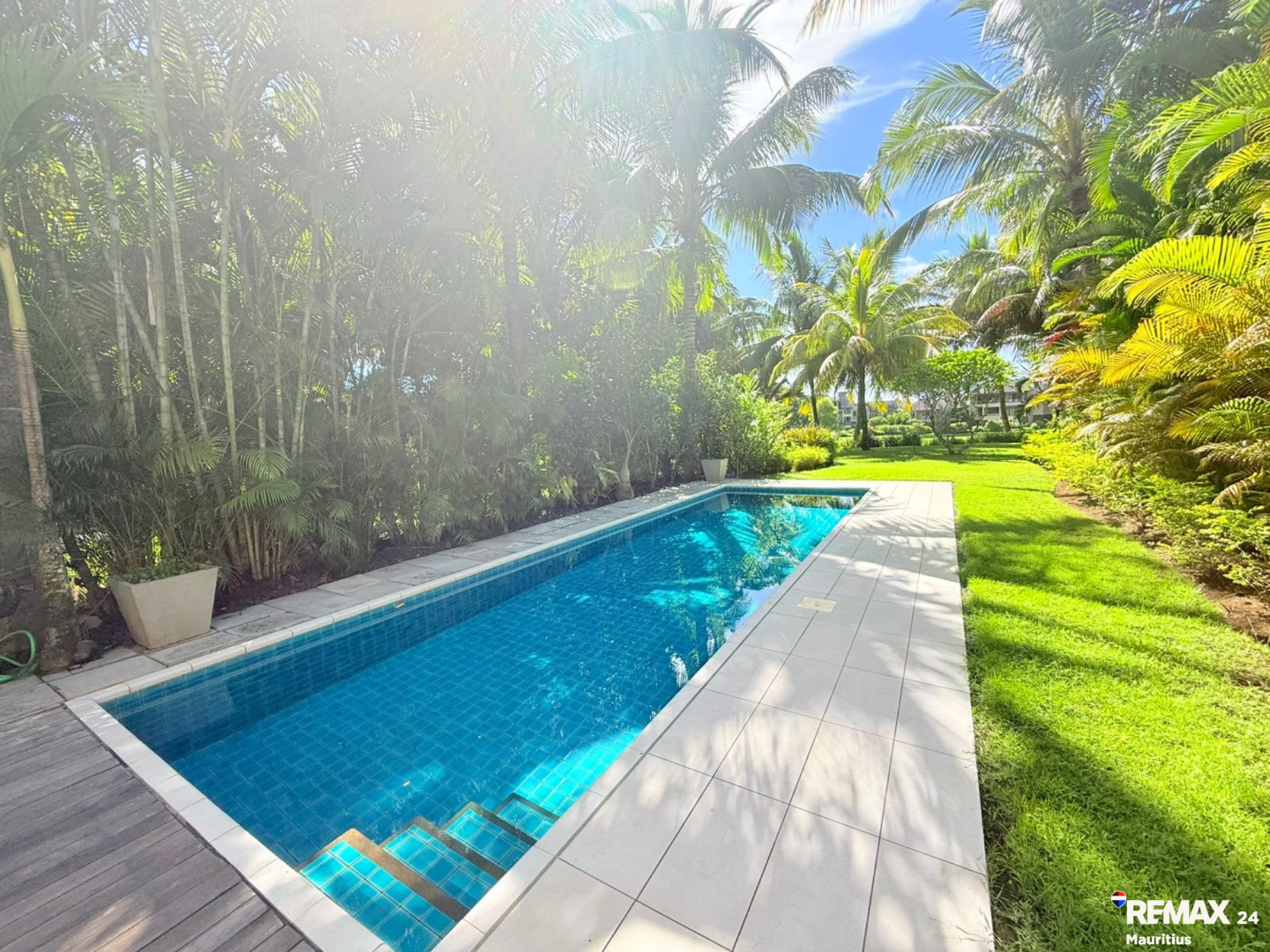 The villa opens onto a private 30 sqm swimming pool, which naturally extends into this long landscaped garden, creating a serene and highly exclusive outdoor lifestyle space.