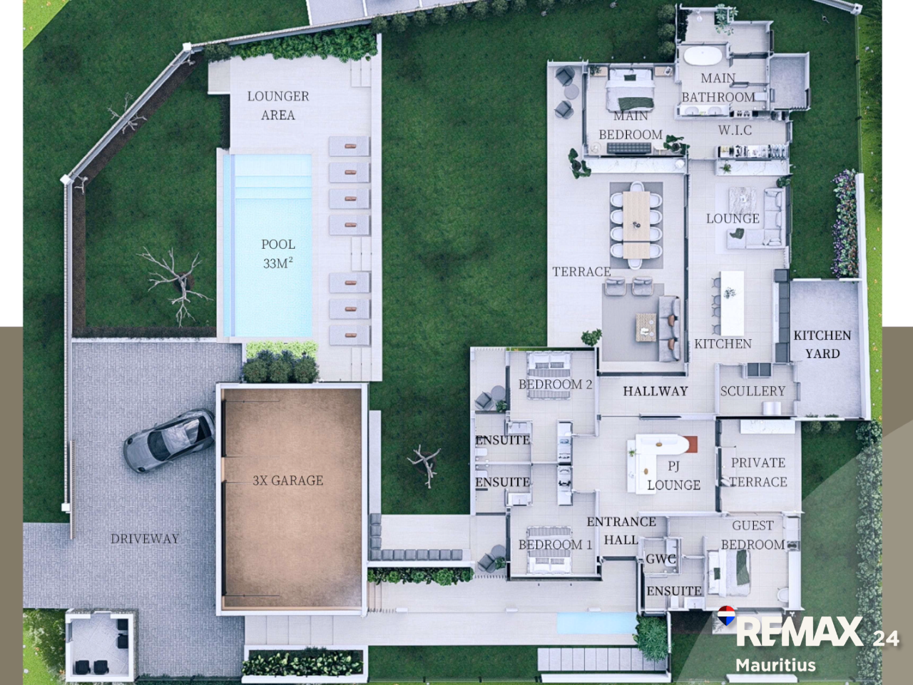Open plan living flows to a large terrace overlooking a 33m² pool and dedicated lounger area. Additional features include a PJ lounge, kitchen with scullery and yard, guest WC, and private terraces.