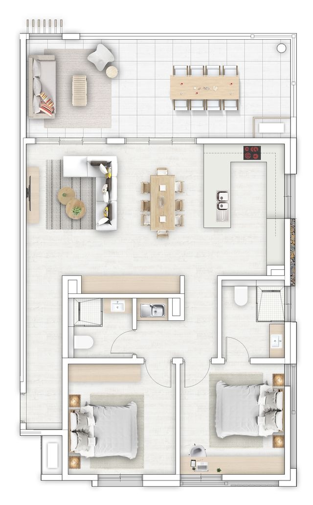 Open-plan kitchen, living and dining area designed for natural light and seamless flow