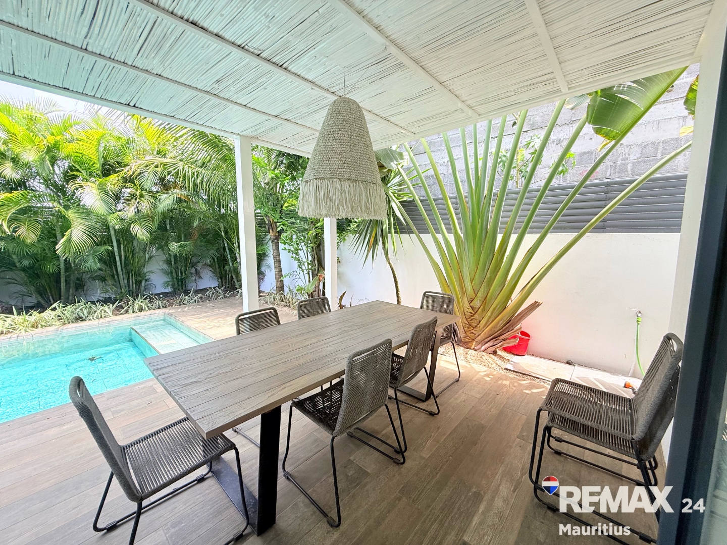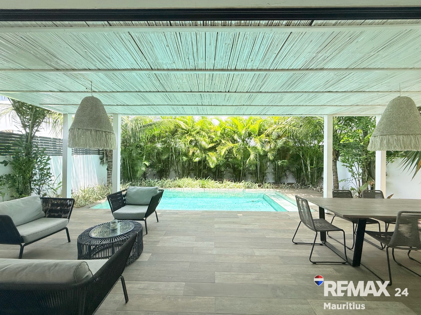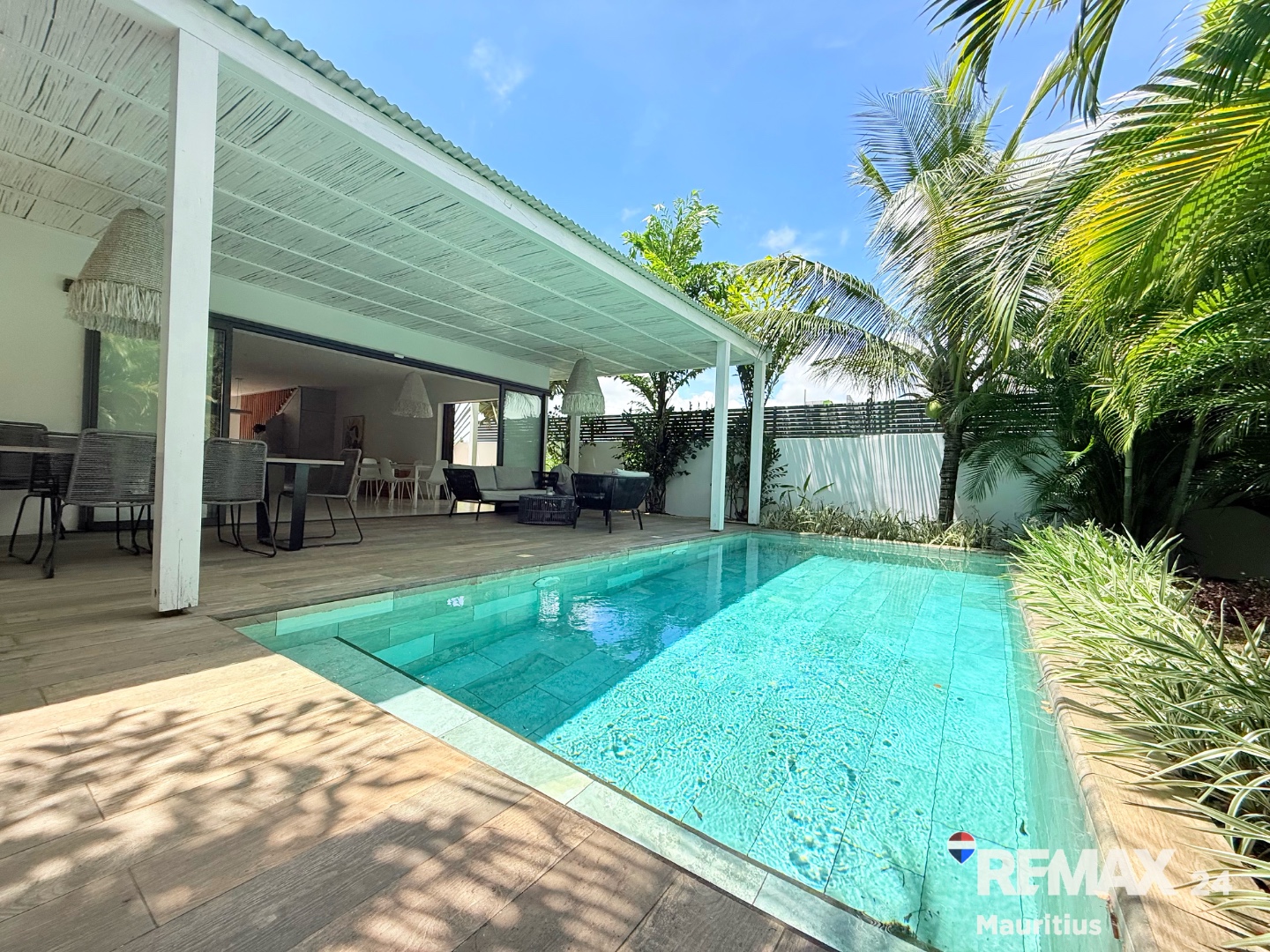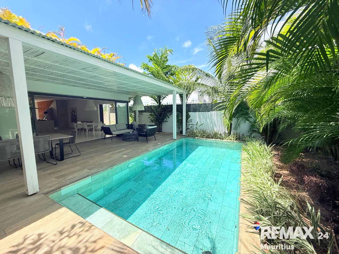 Set in a lush tropical garden with no overlooking, this fully furnished home features a designer equipped kitchen with central island, polished concrete floors, a covered terrace, and a private swimming pool (8 x 3.5 m).