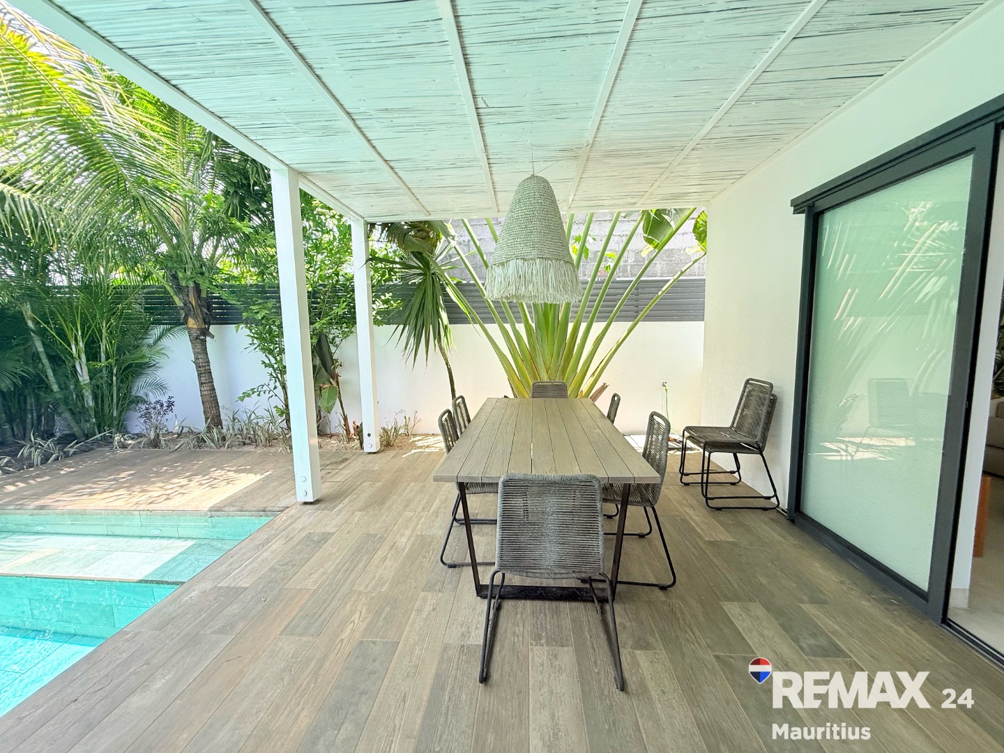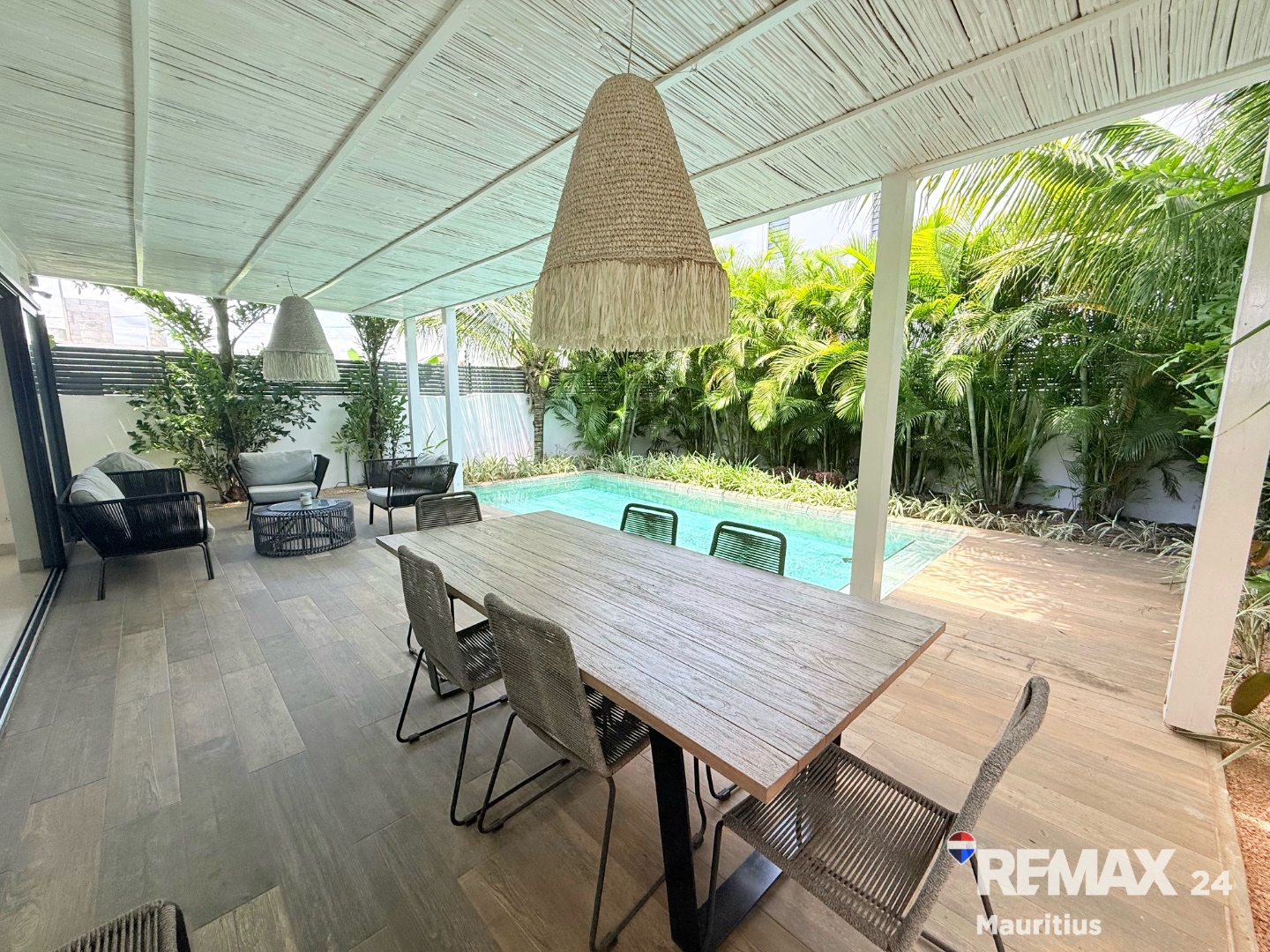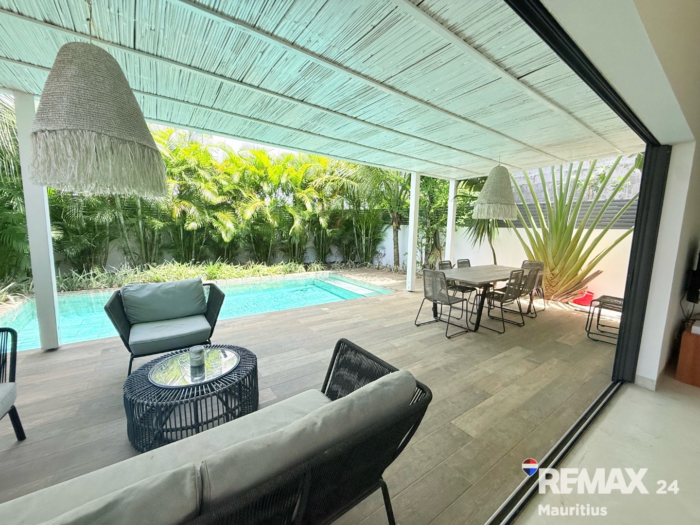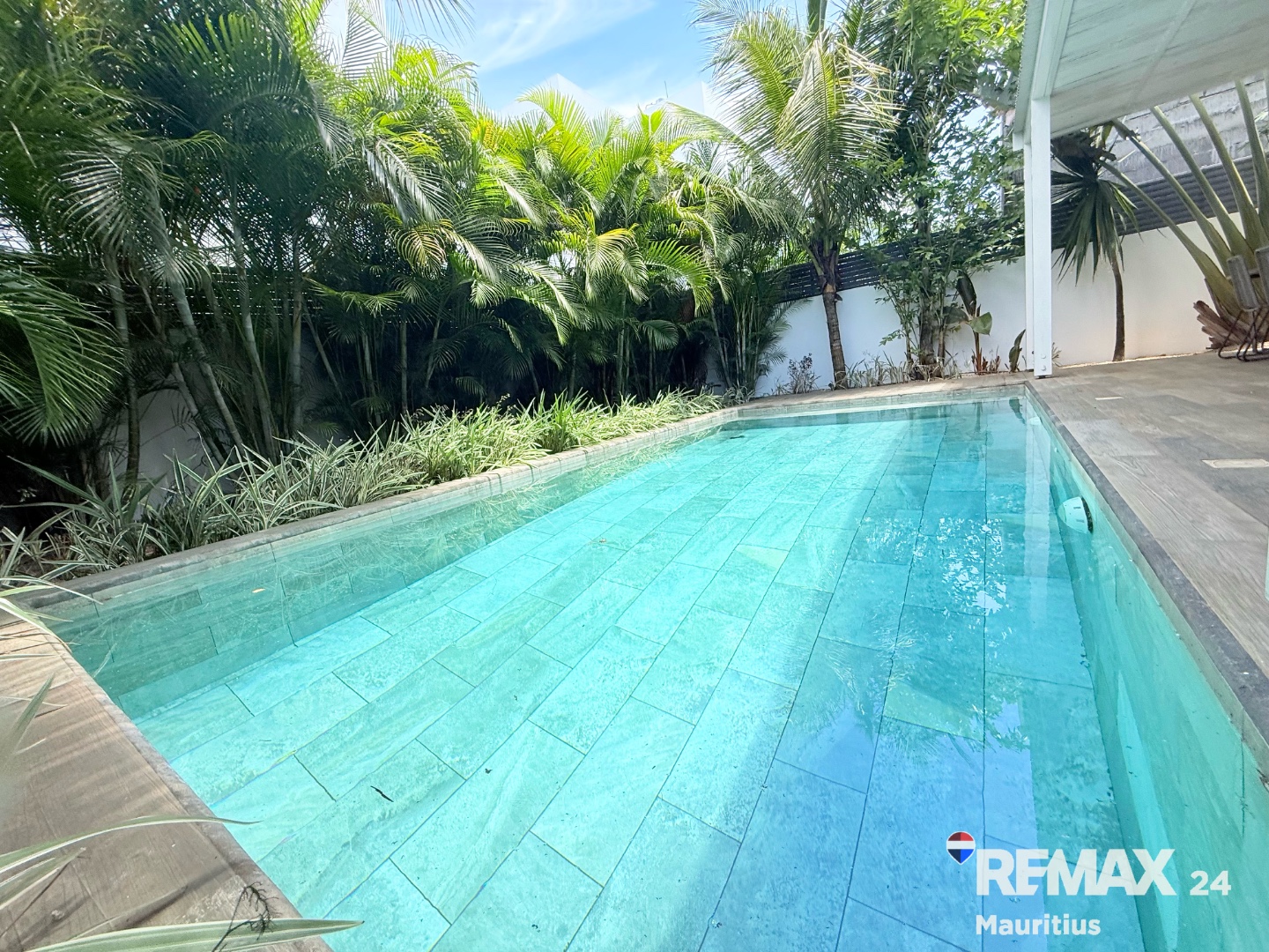 Set in a lush tropical garden with no overlooking, this fully furnished home features a designer equipped kitchen with central island, polished concrete floors, a covered terrace, and a private swimming pool (8 x 3.5 m).