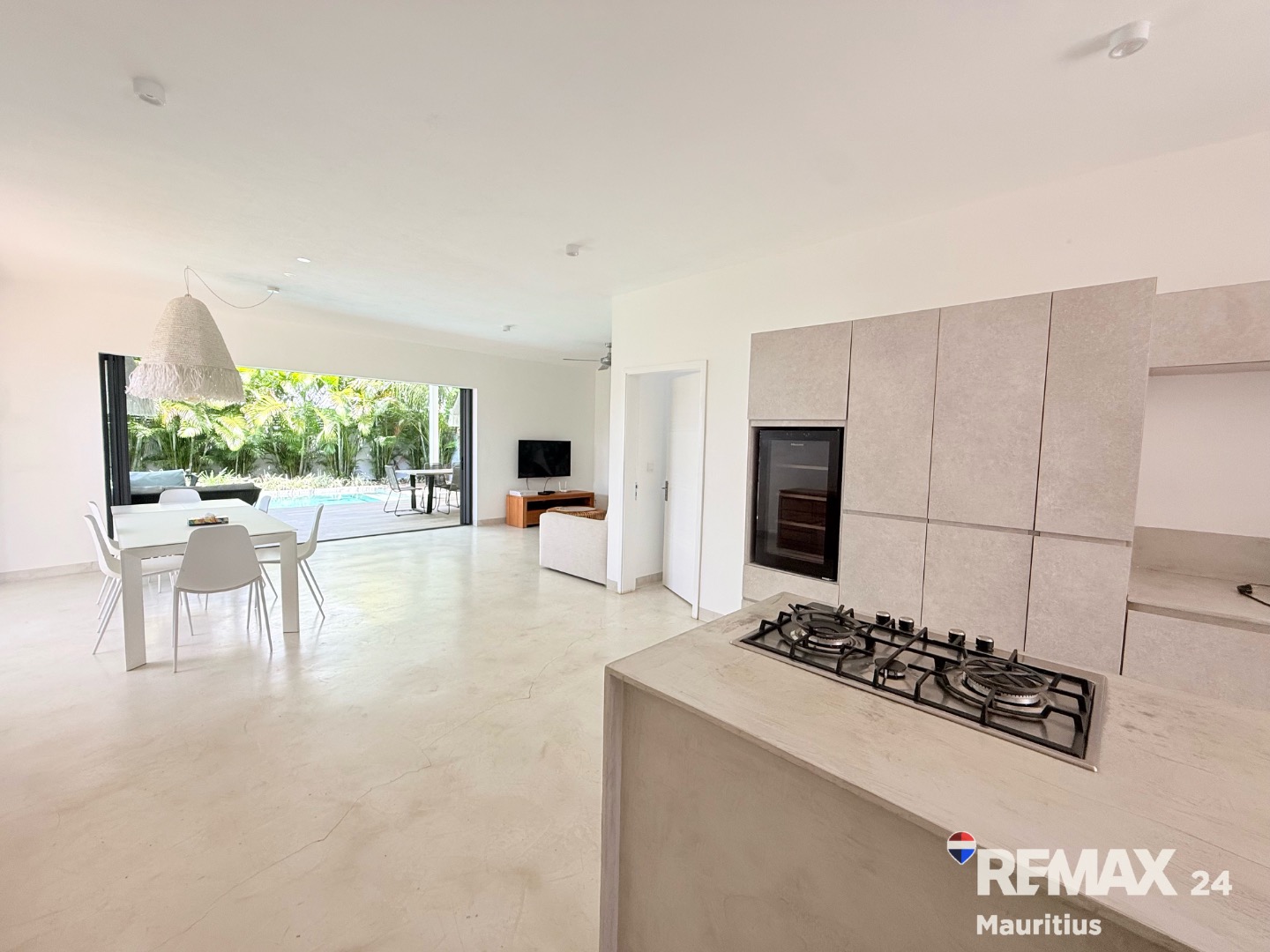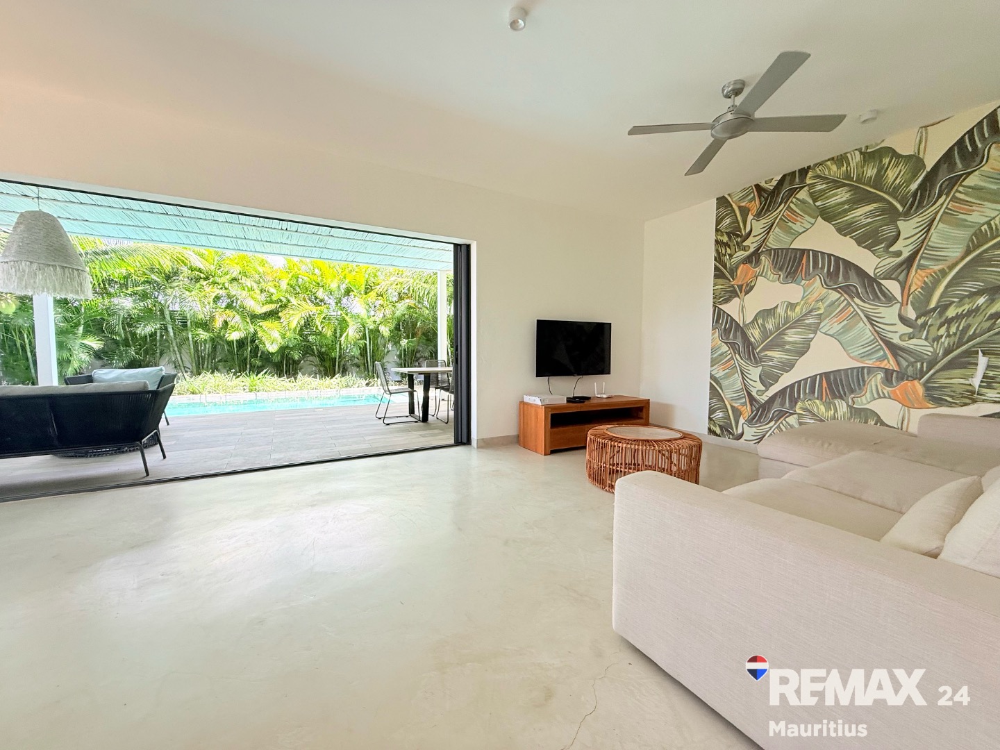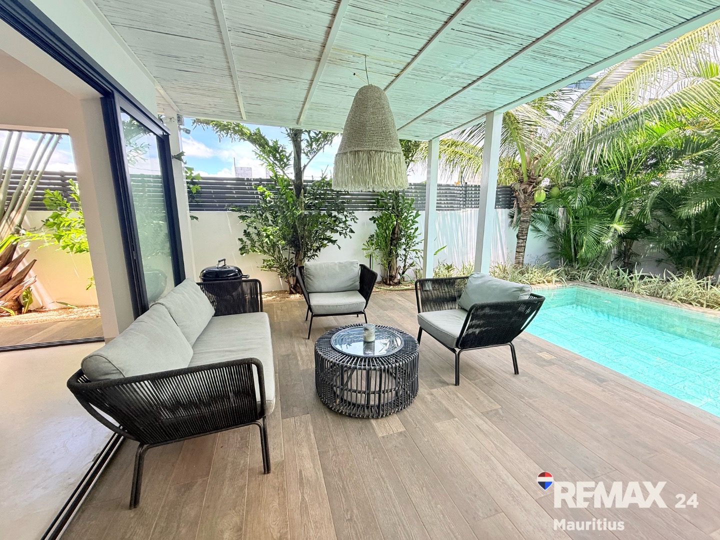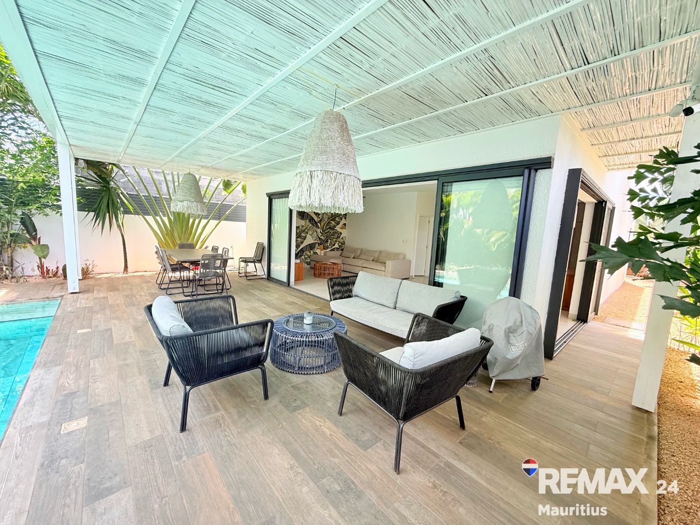 Set in a lush tropical garden with no overlooking, this fully furnished home features a designer equipped kitchen with central island, polished concrete floors, a covered terrace, and a private swimming pool (8 x 3.5 m).