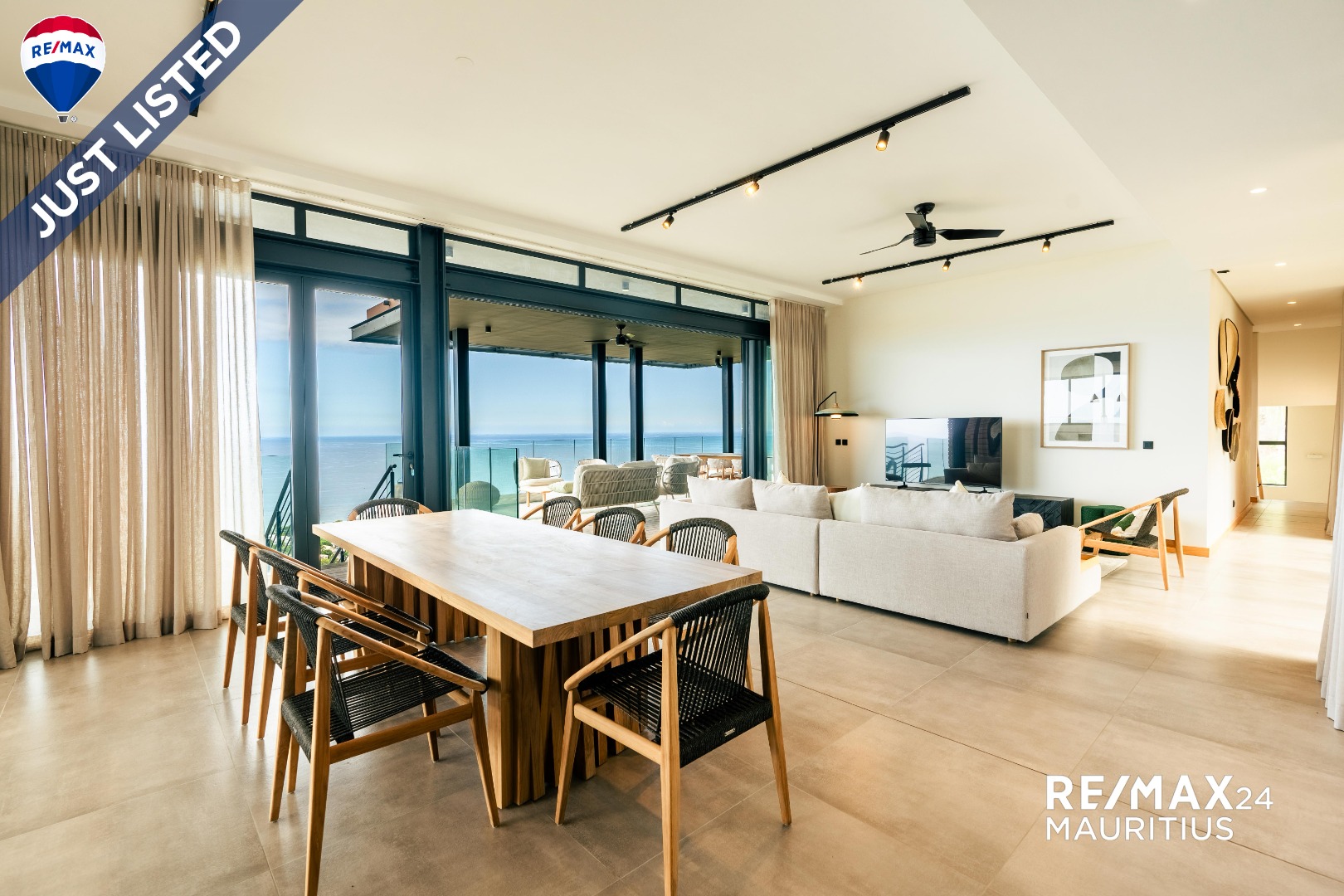 - A spacious living and dining area with floor-to-ceiling glass doors opening onto a covered terrace