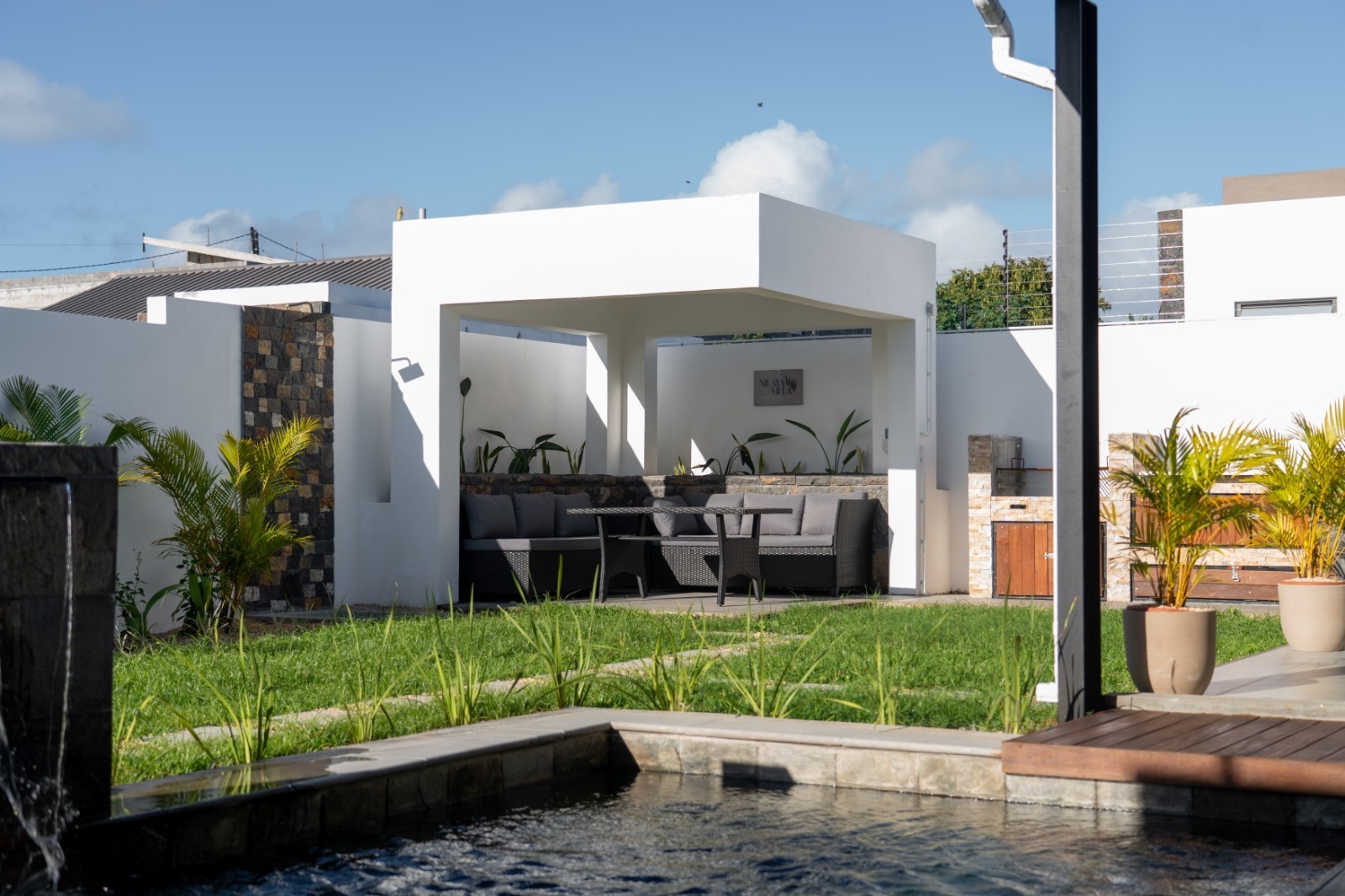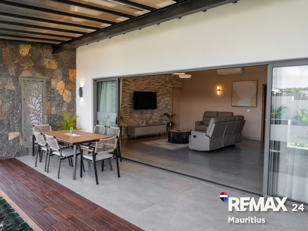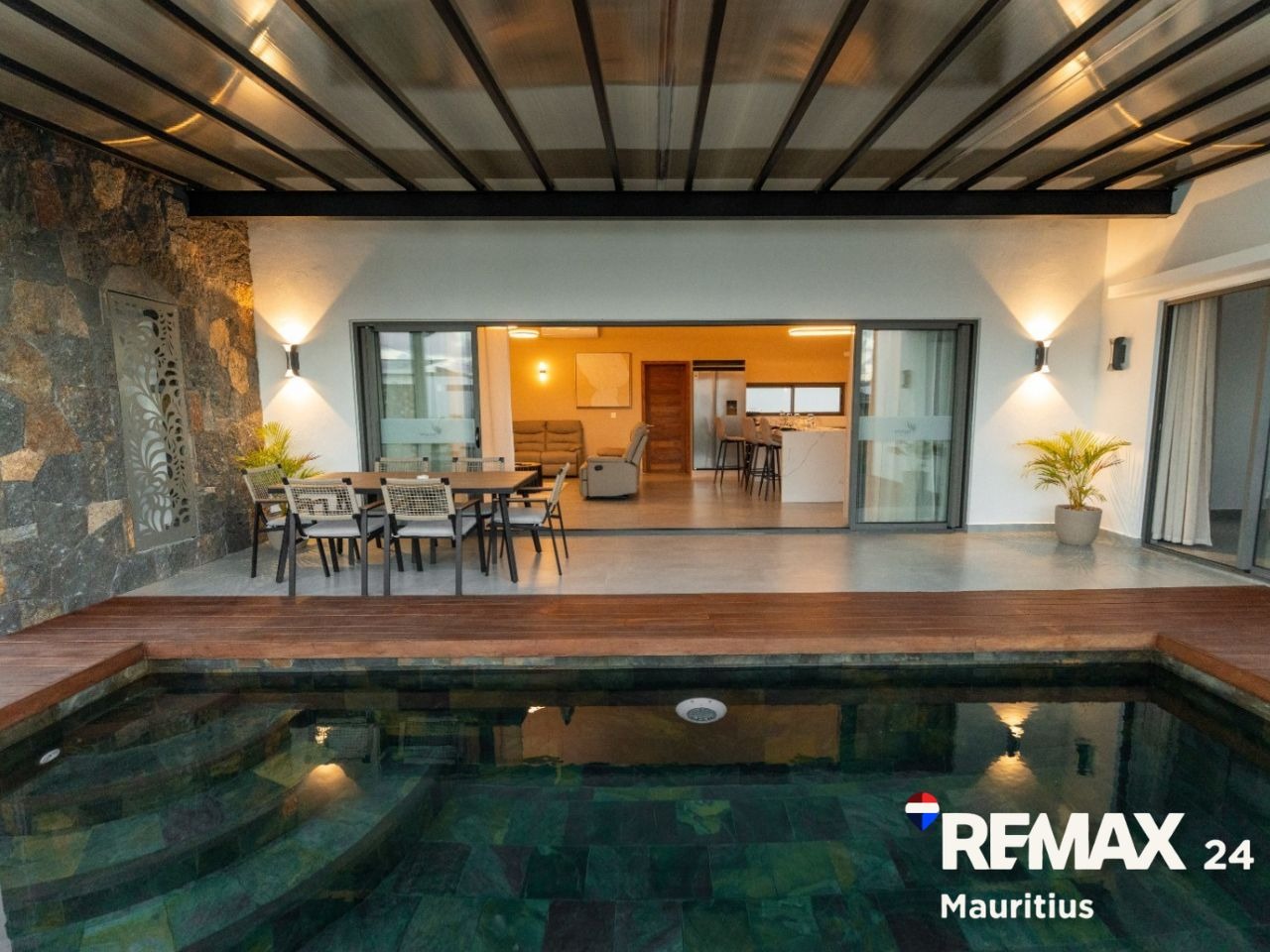 Open planned equipped kitchen, dining, tv lounge and a spacious terrace overlooking the private pool and garden.