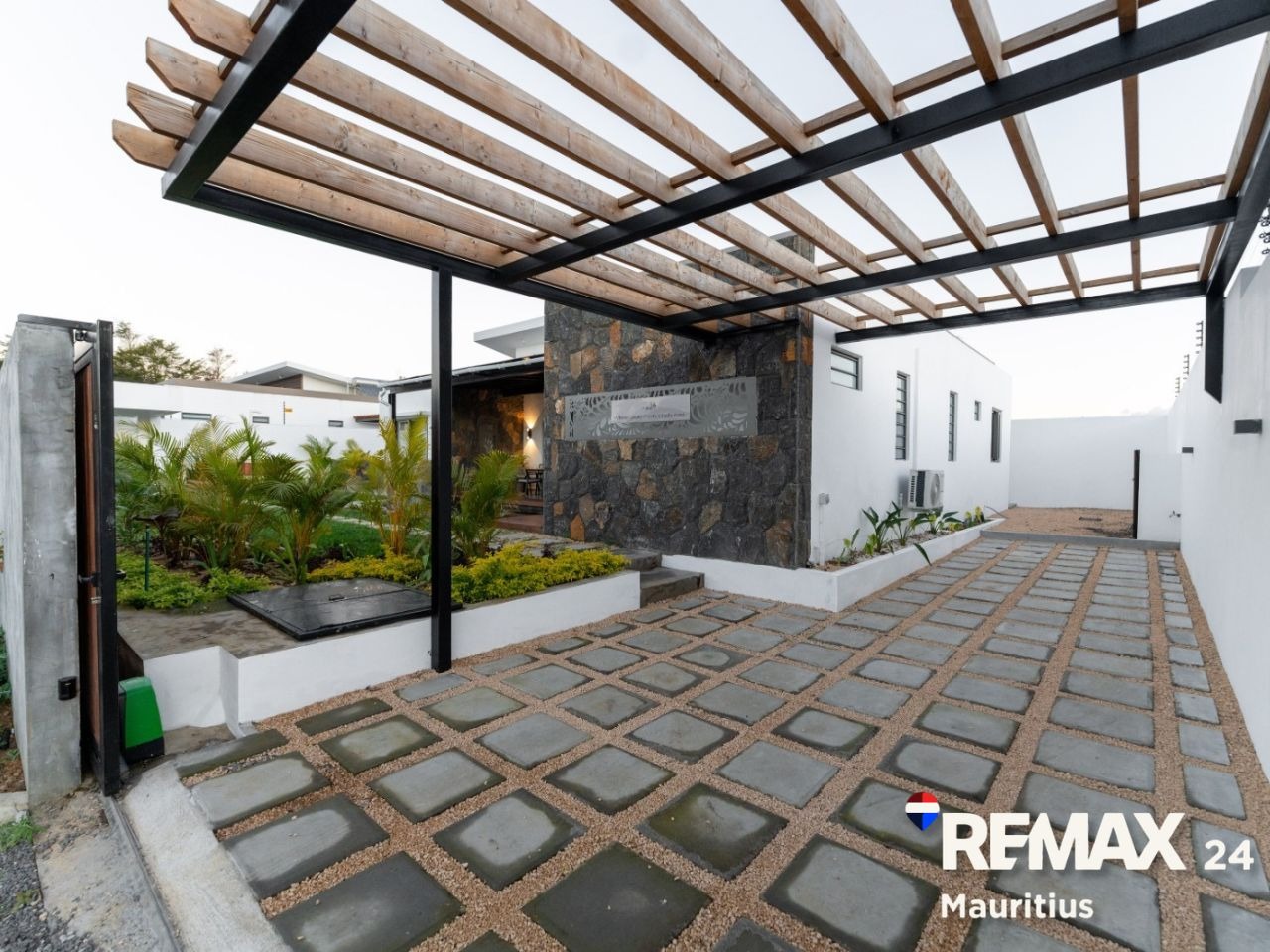 A double pergola carport that new owners can personalize or totally cover at their personal taste and requirement.
