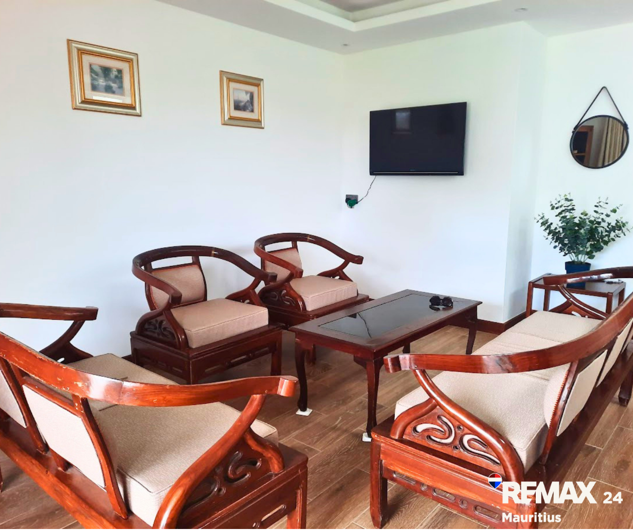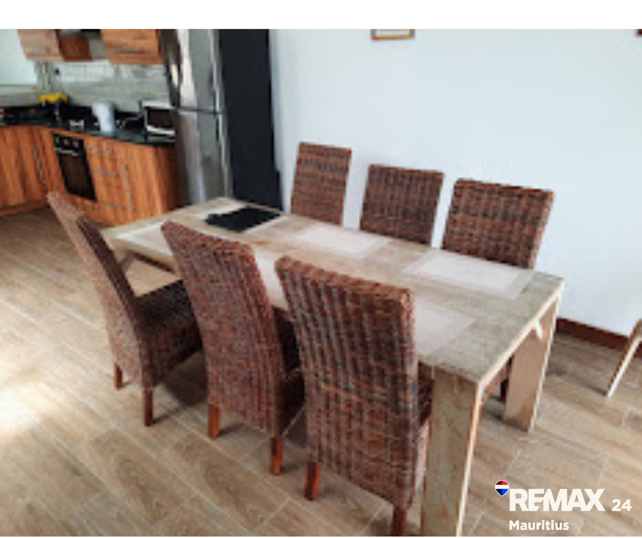 Discover this inviting 3-bedroom, 2-bathroom furnished residence available for rent in the secure coastal estate of Trou Aux Biches, Republic Of Mauritius. The interior boasts a modern aesthetic with clean wood-look tiled flooring, white walls, and stylish dark wood furniture, creating a bright and welcoming atmosphere. The layout includes a spacious lounge, two distinct dining areas, a dedicated study, and a family TV room, providing ample space for relaxation and entertainment. The contemporary kitchen is well-appointed with elegant wooden cabinetry, black countertops, modern appliances, and a convenient pantry.