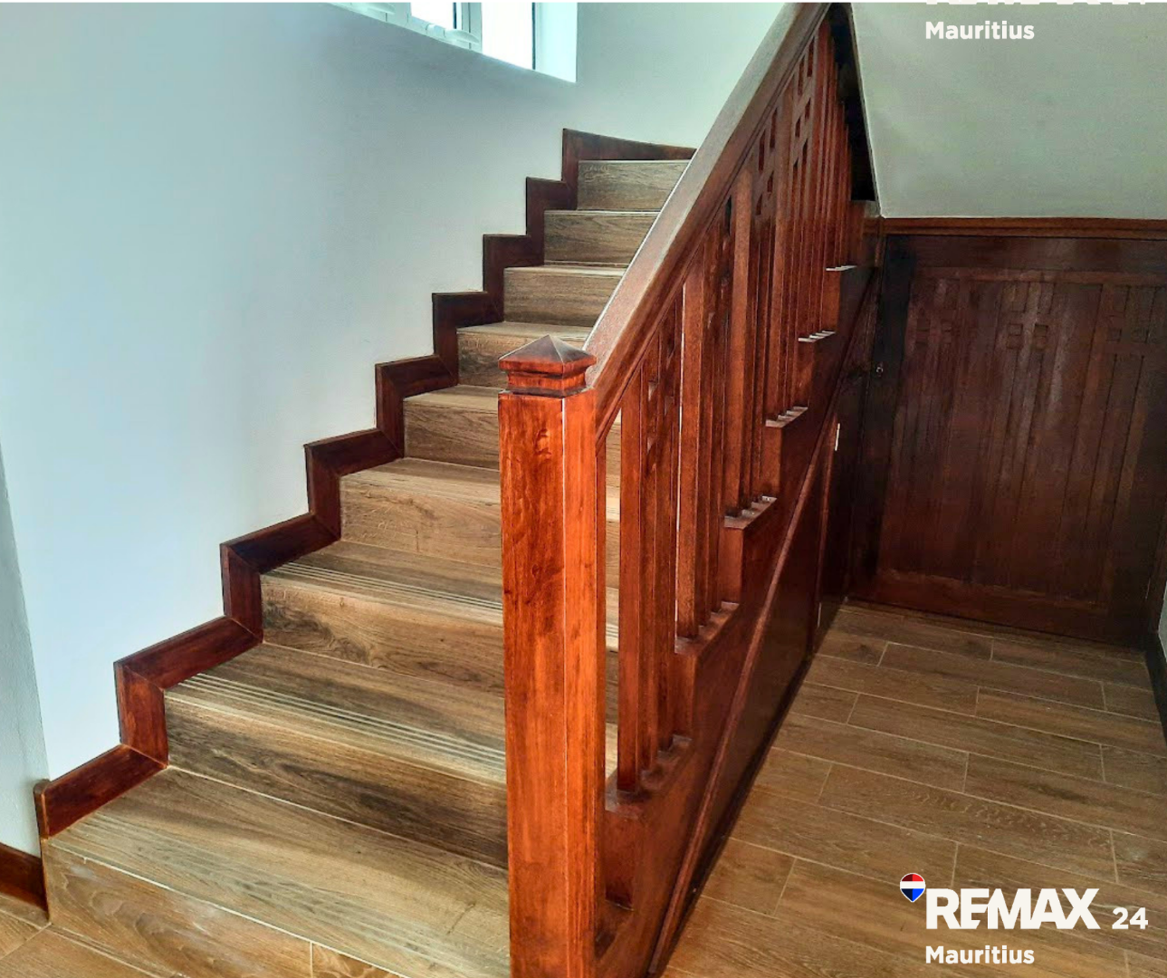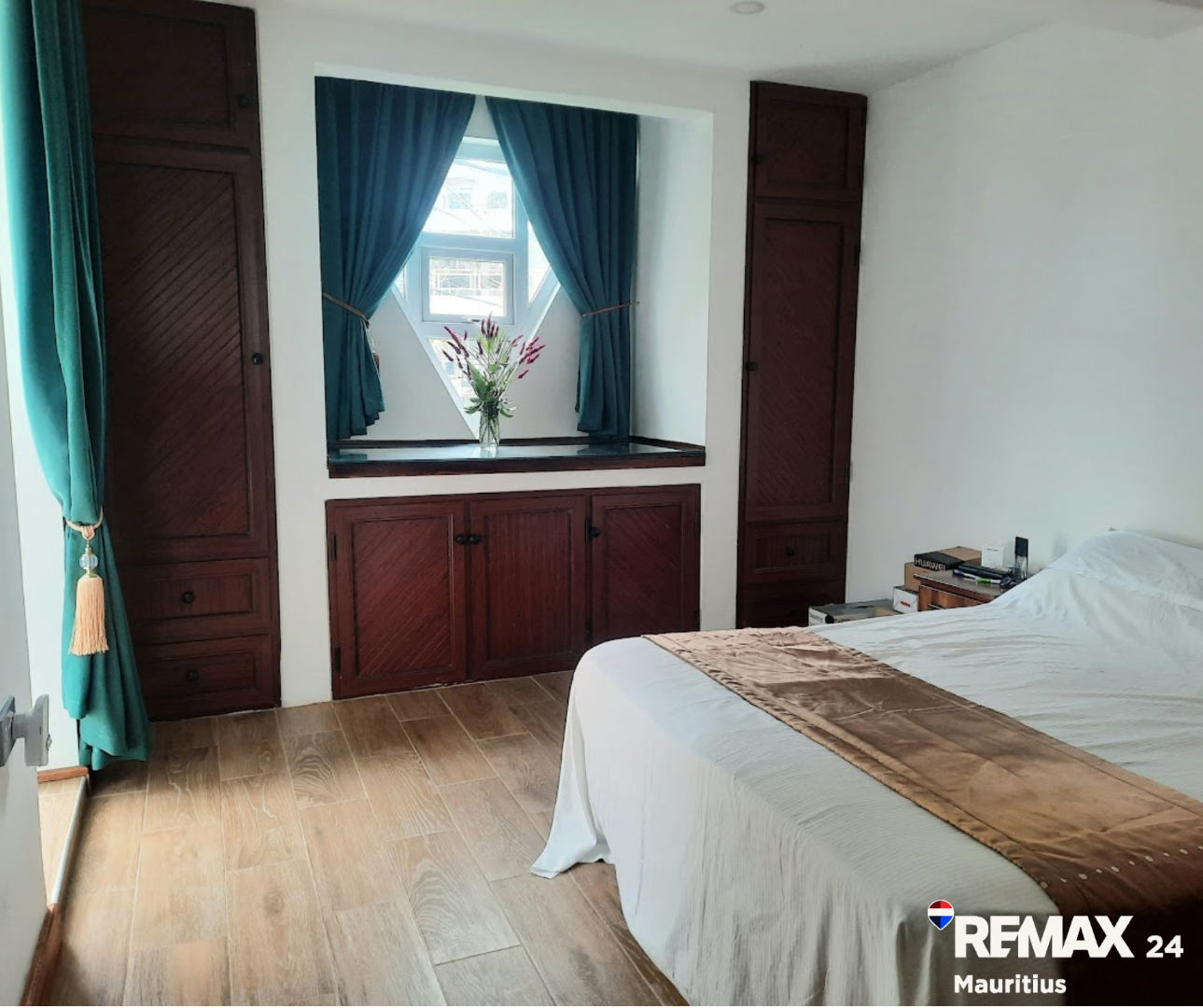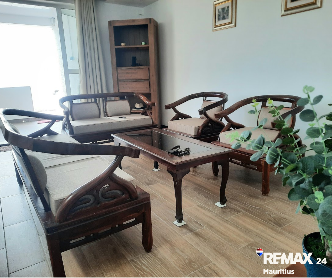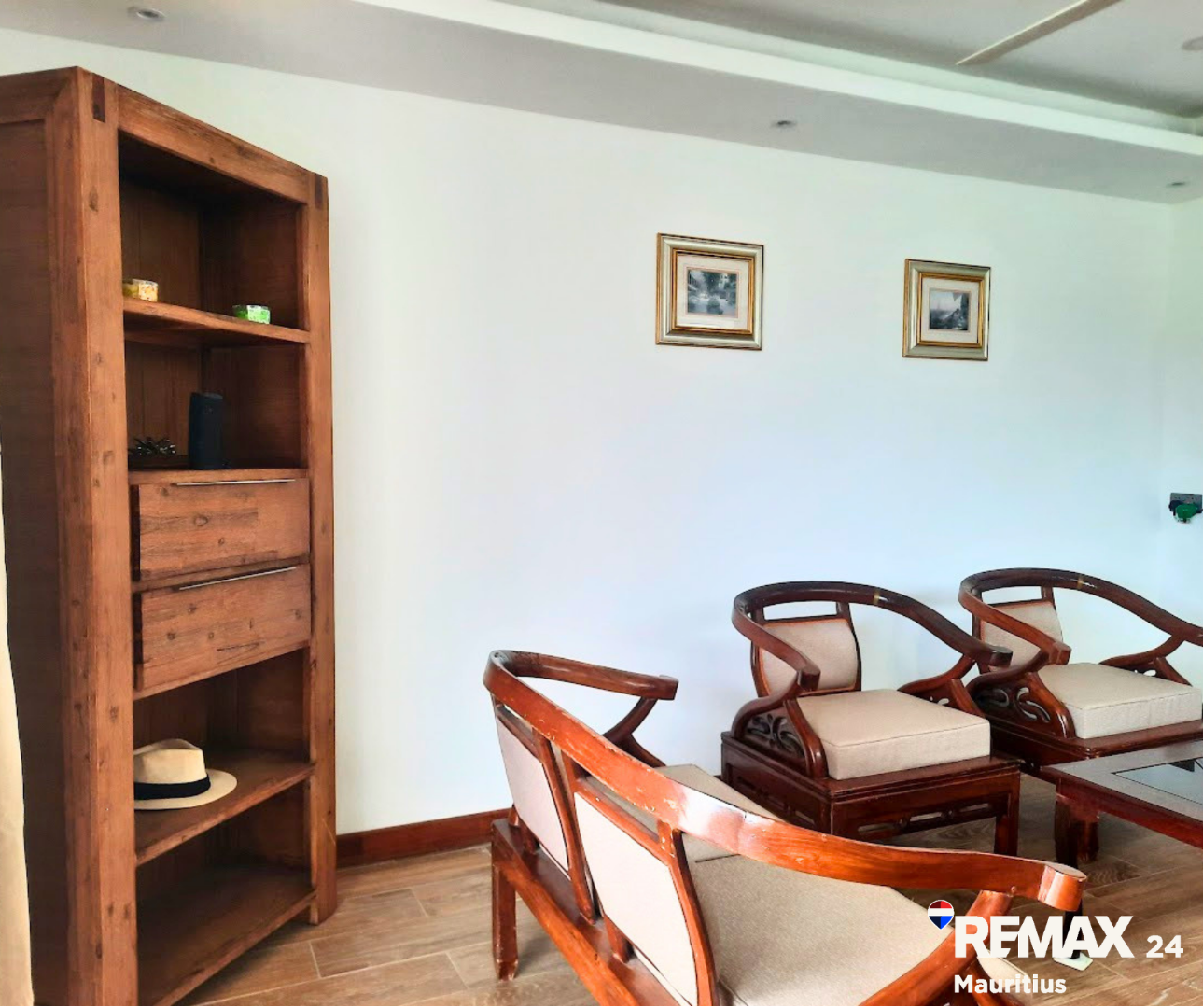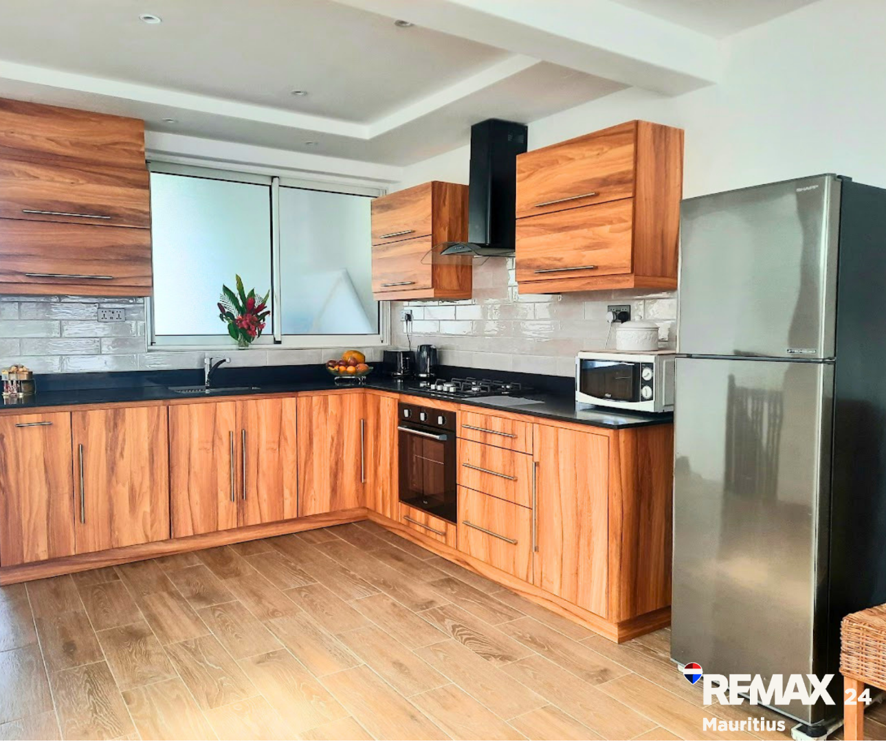 Discover this inviting 3-bedroom, 2-bathroom furnished residence available for rent in the secure coastal estate of Trou Aux Biches, Republic Of Mauritius. The interior boasts a modern aesthetic with clean wood-look tiled flooring, white walls, and stylish dark wood furniture, creating a bright and welcoming atmosphere. The layout includes a spacious lounge, two distinct dining areas, a dedicated study, and a family TV room, providing ample space for relaxation and entertainment. The contemporary kitchen is well-appointed with elegant wooden cabinetry, black countertops, modern appliances, and a convenient pantry.
